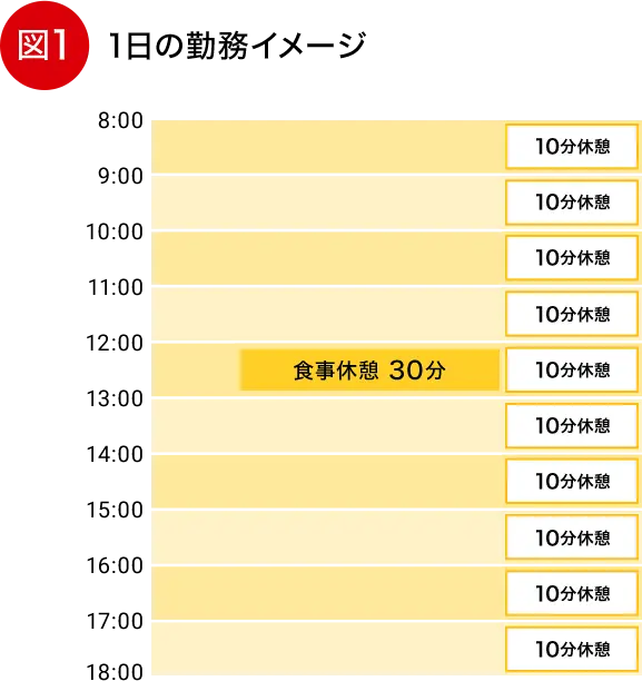 食事休憩以外に1時間ごとに10分の休憩を導入し