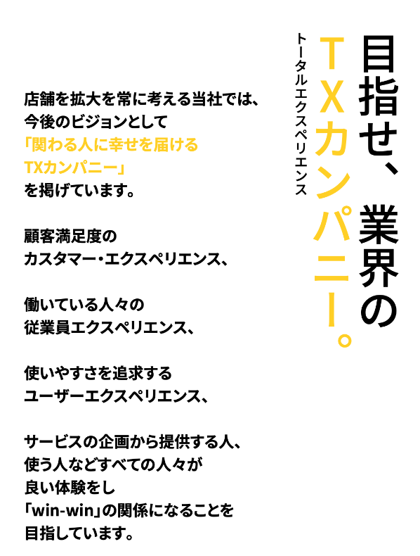 「店長として経営スキルを磨く」もよし、「バックオフィスで今後の展開や戦略を考える」もよし、「独立して一国の主になる」もよし。働く理由は人によって様々で多様。せっかくだから一人ひとりのスタッフが納得して自分の人生を歩んでほしい。ぜひ、あなたの思いや志を実現・チャレンジしてください。